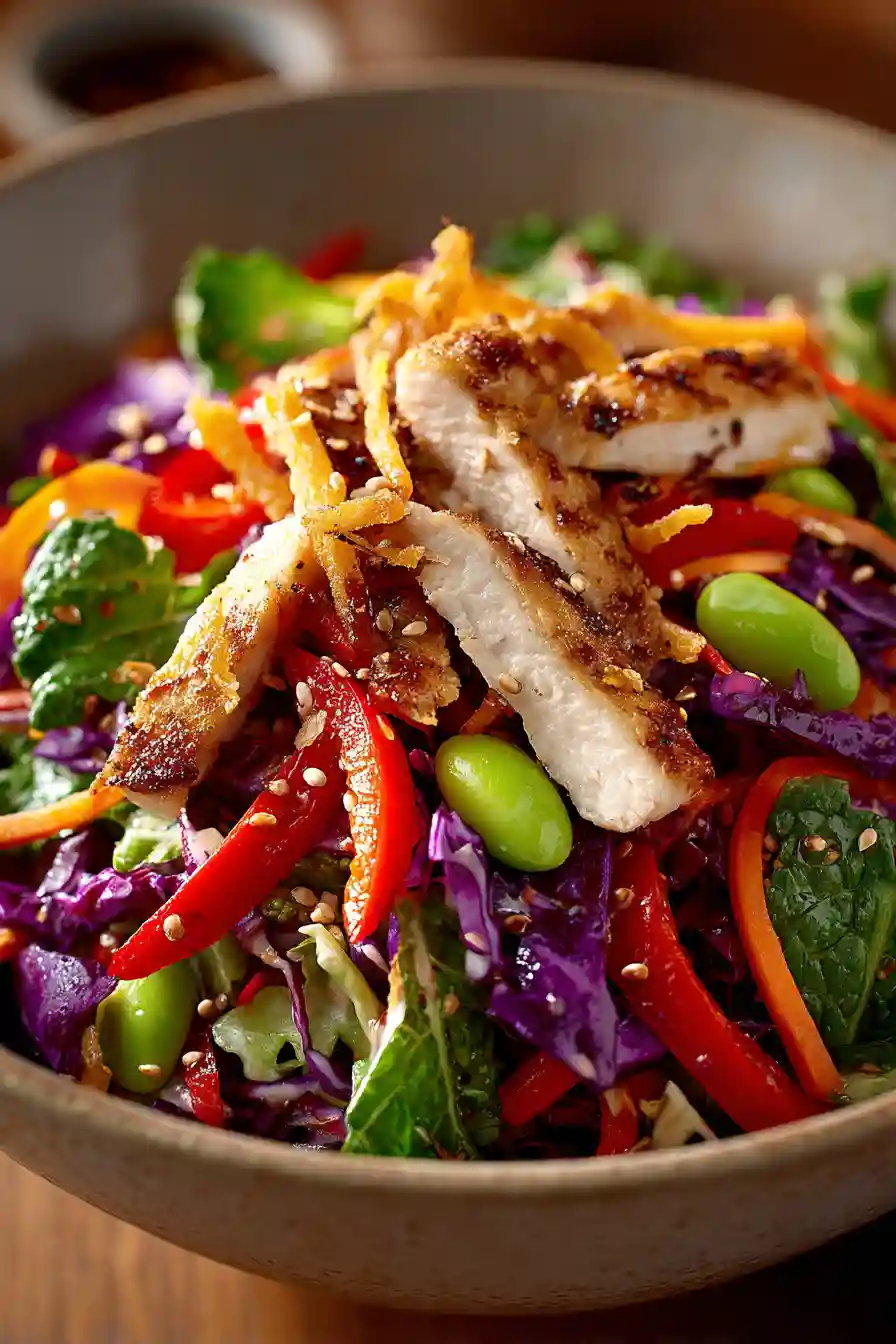 Asian chicken crunch salad includes shredded cabbage, cooked chicken, carrots, bell peppers, edamame, green onions, crunchy toppings, and a sesame-based dressing.