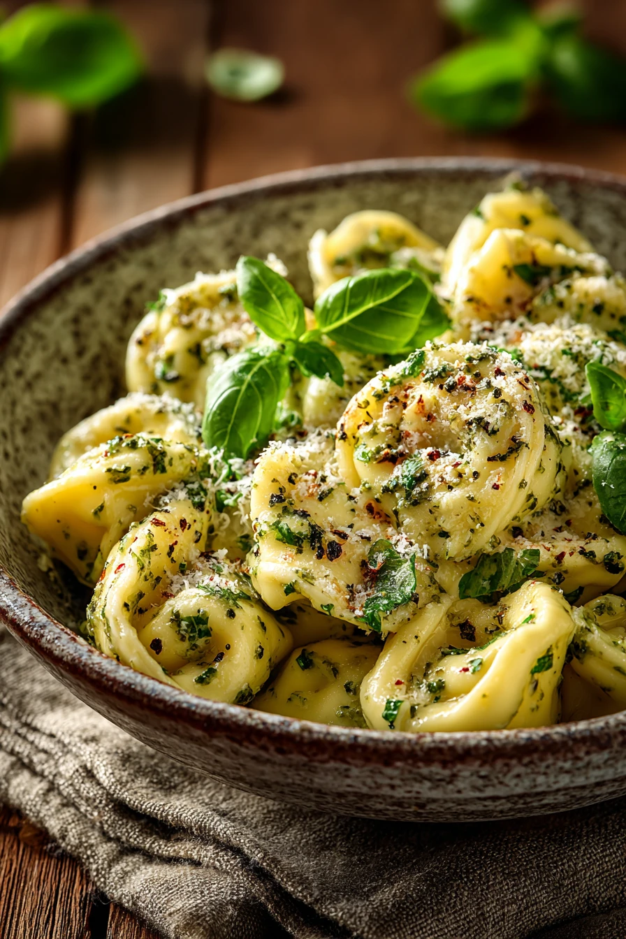 Creamy cheesy pesto tortellini with basil and Parmesan.