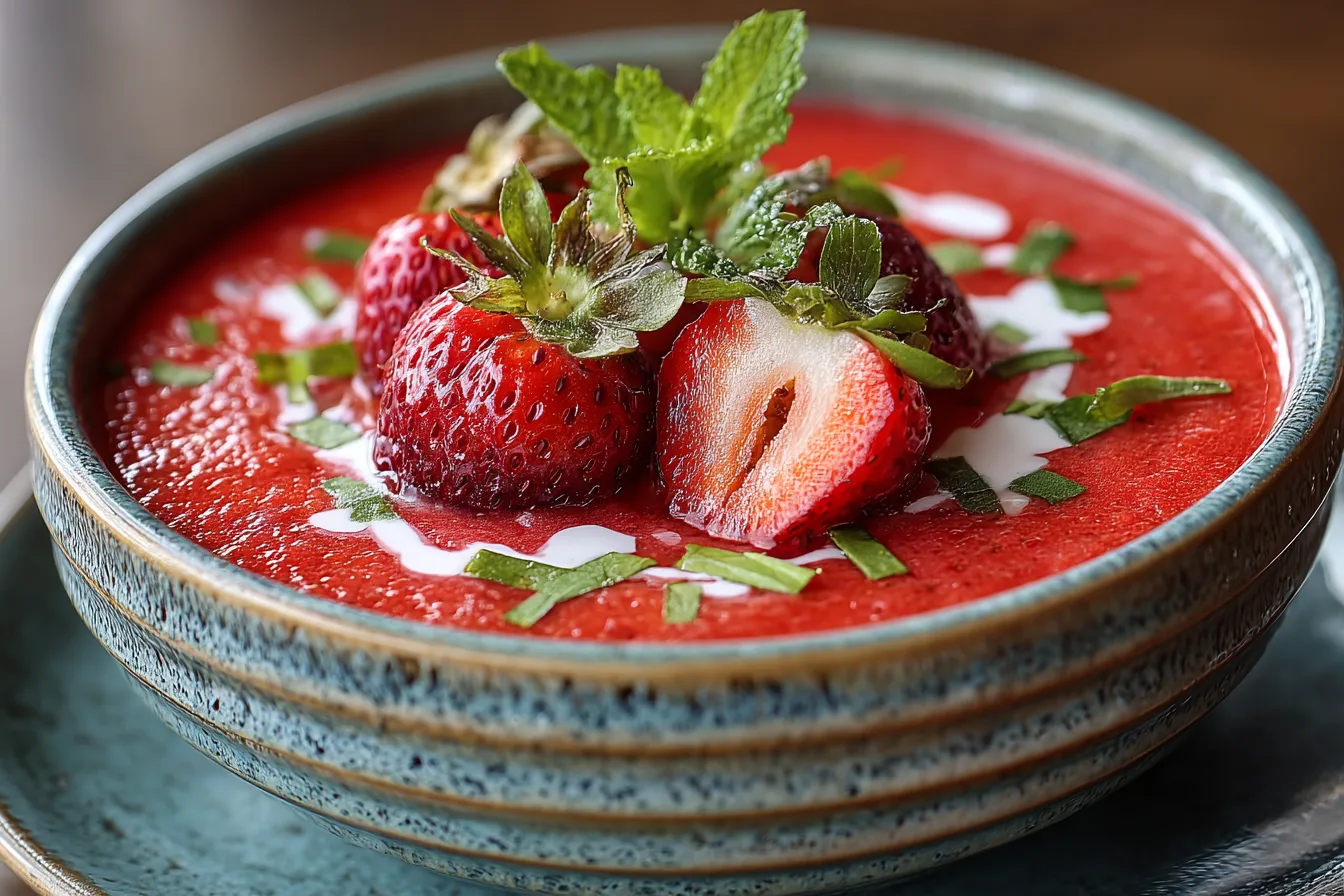 A vibrant, cold soup blending ripe tomatoes, strawberries, basil, olive oil, and vinegar for a tangy, garden-fresh taste. Perfect for summer meals or light appetizers.