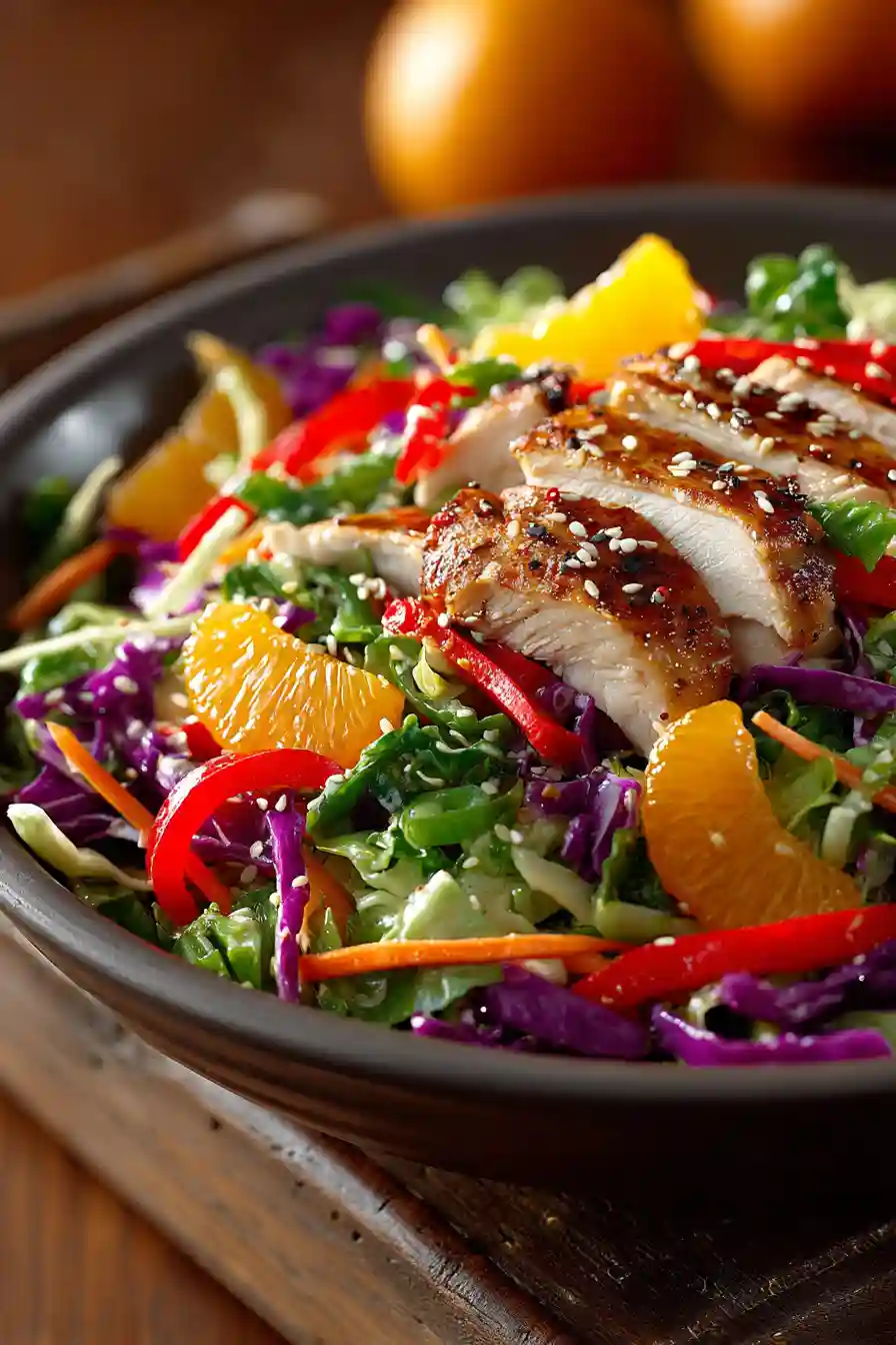It includes shredded cabbage, cooked chicken, carrots, bell peppers, green onions, crunchy toppings, and sesame dressing.