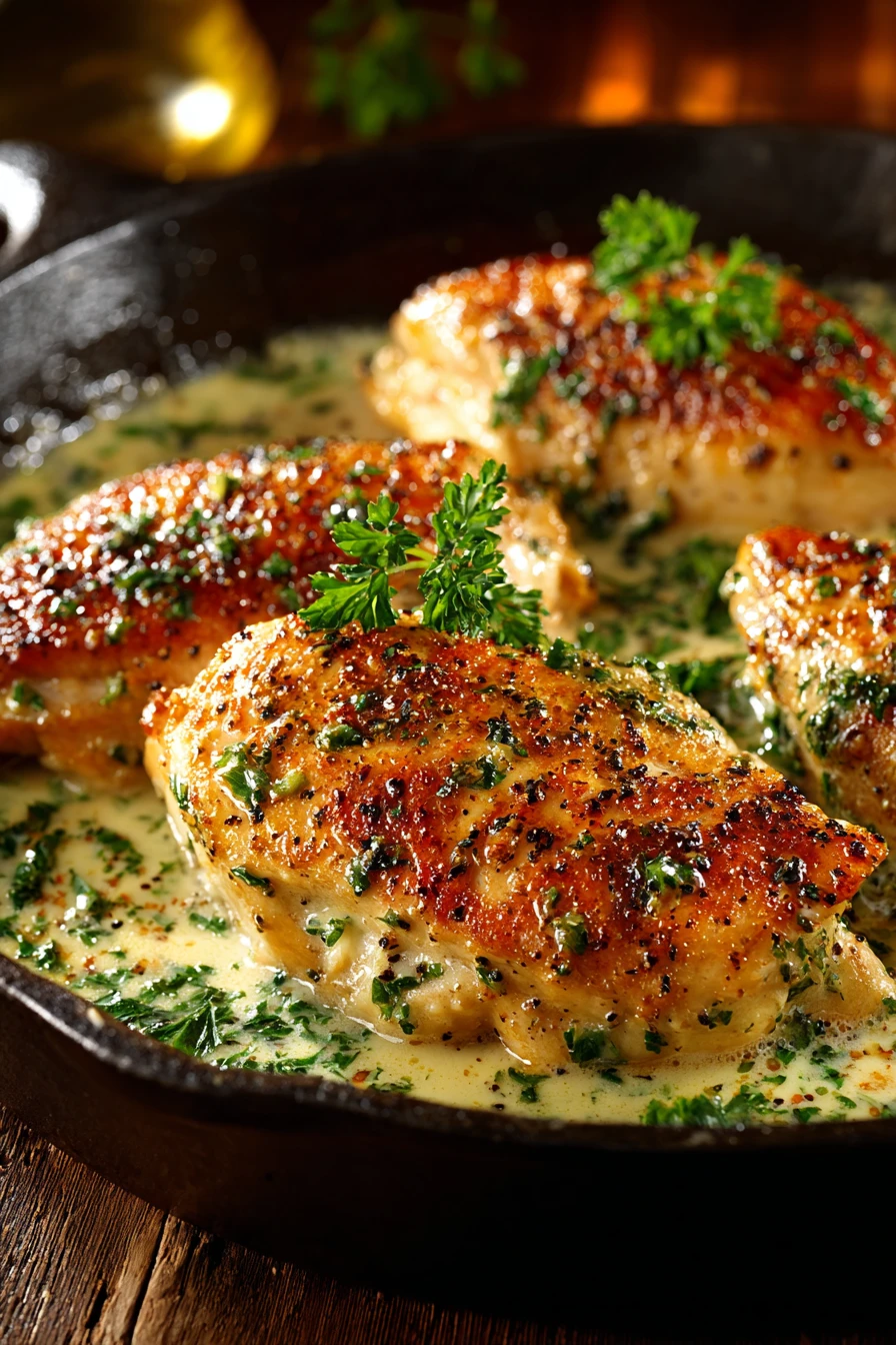 It’s a one-pan chicken recipe cooked in butter, garlic, and cream. The sauce becomes thick, luscious, and perfect for drizzling over your favorite sides.