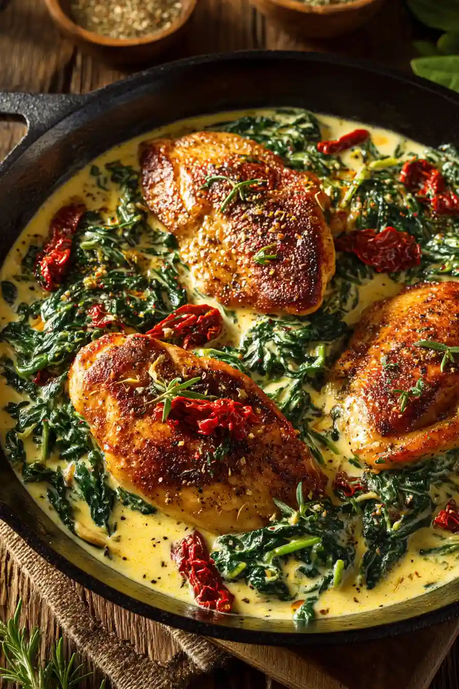 Creamy Tuscan Chicken with Spinach features tender chicken in a rich garlic cream sauce with sun-dried tomatoes.