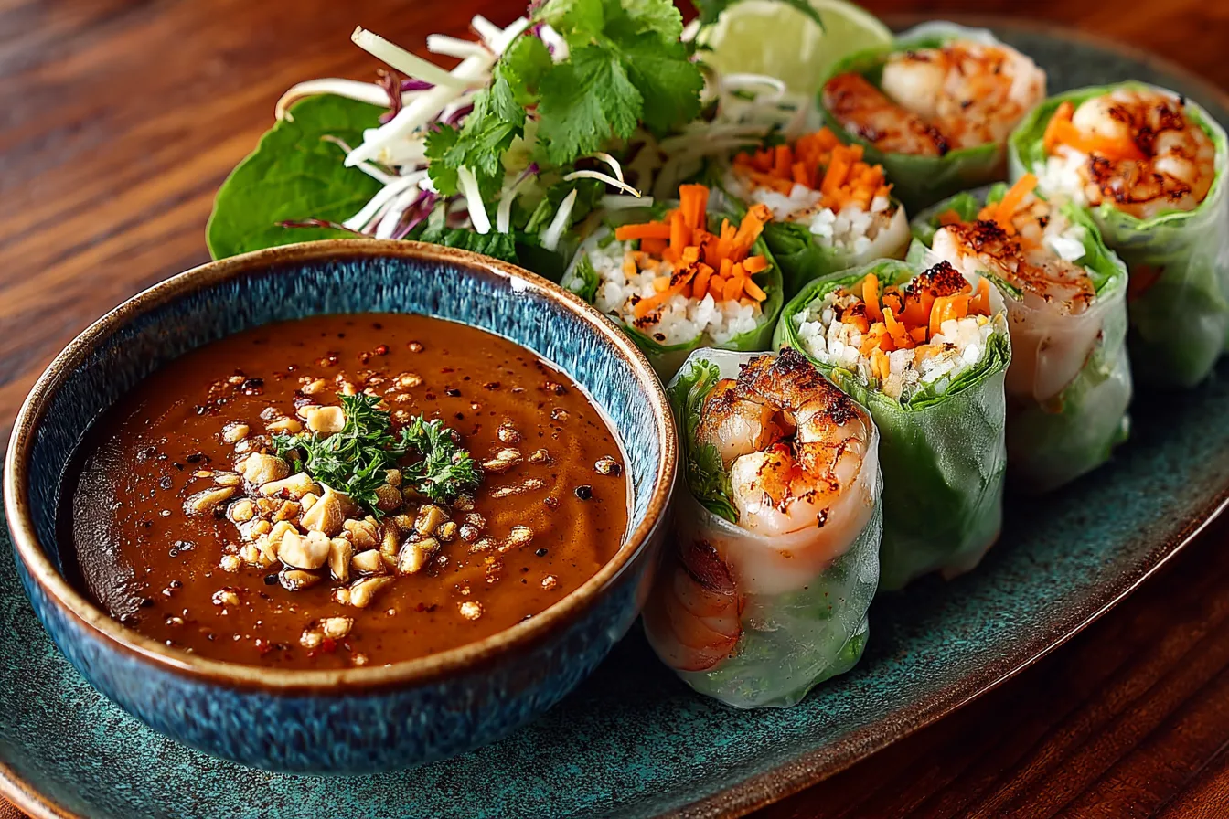 Light, refreshing Vietnamese summer rolls filled with shrimp, vermicelli, and fresh vegetables, wrapped in thin rice paper and served with a creamy peanut sauce. Gluten-free, halal-friendly, and bursting with authentic flavors.