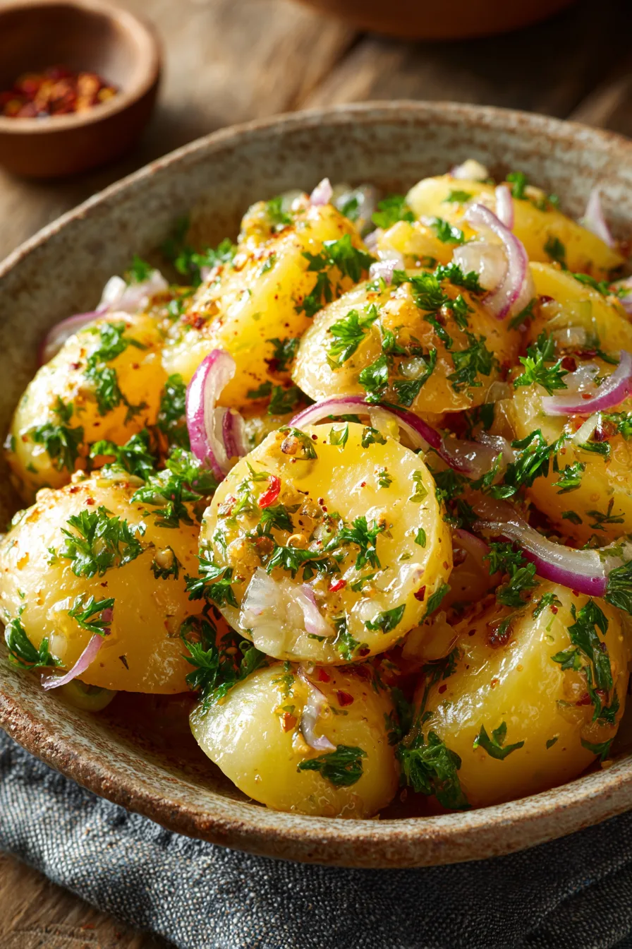 Tender potatoes tossed in a warm, tangy vinegar dressing define this German Potato Salad (No Bacon). Dijon mustard and fresh herbs add bold flavor without heavy ingredients. This classic side dish tastes bright, savory, and perfect for serving warm alongside hearty meals.
