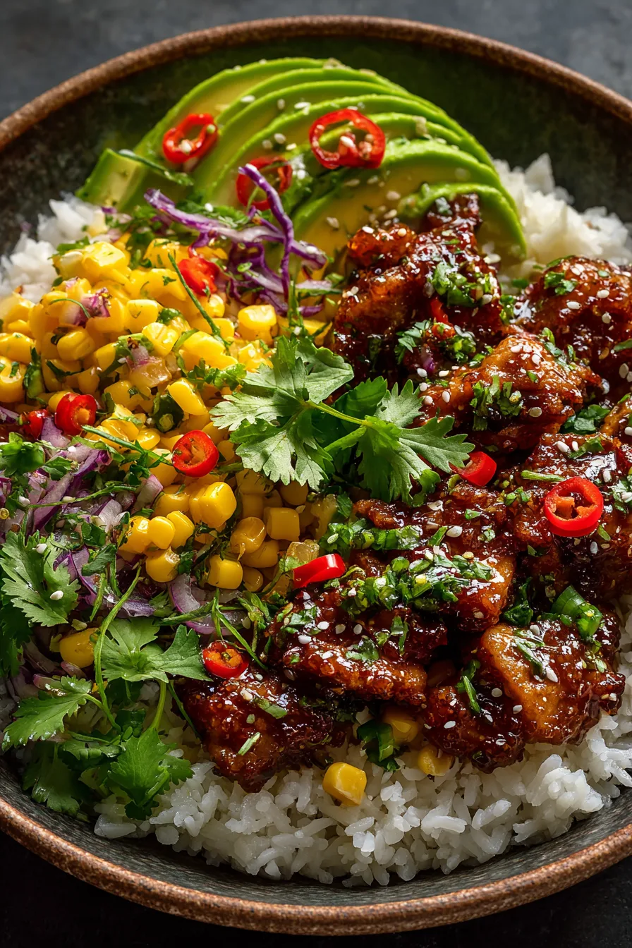 7. Build Hot Honey Chicken Bowls with Fresh Corn Salsa by adding rice, glazed chicken, corn salsa, and avocado.