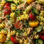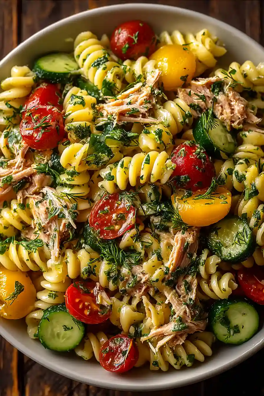 SEO Description: Pasta salad with tuna, fresh herbs, vegetables, and light lemon dressing.