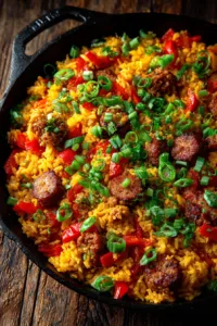 This One-Pot Spicy Sausage and Rice is a hearty, flavor-packed meal made with smoky sausage, tender rice, and bold Cajun spices — all cooked in one pan for easy cleanup.