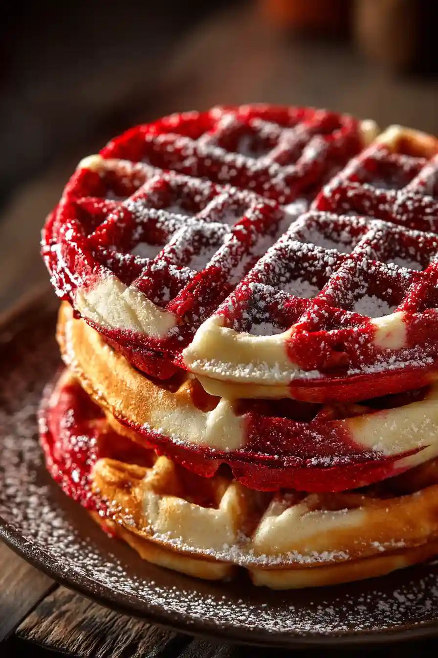 Red velvet marble waffles with a soft interior and crisp edges, finished with a light cocoa swirl.