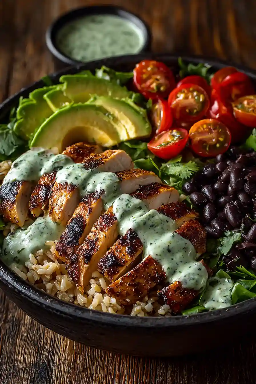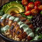 Healthy Peruvian Chicken Rice Bowl with grilled chicken, rice, fresh vegetables, and light cilantro sauce.