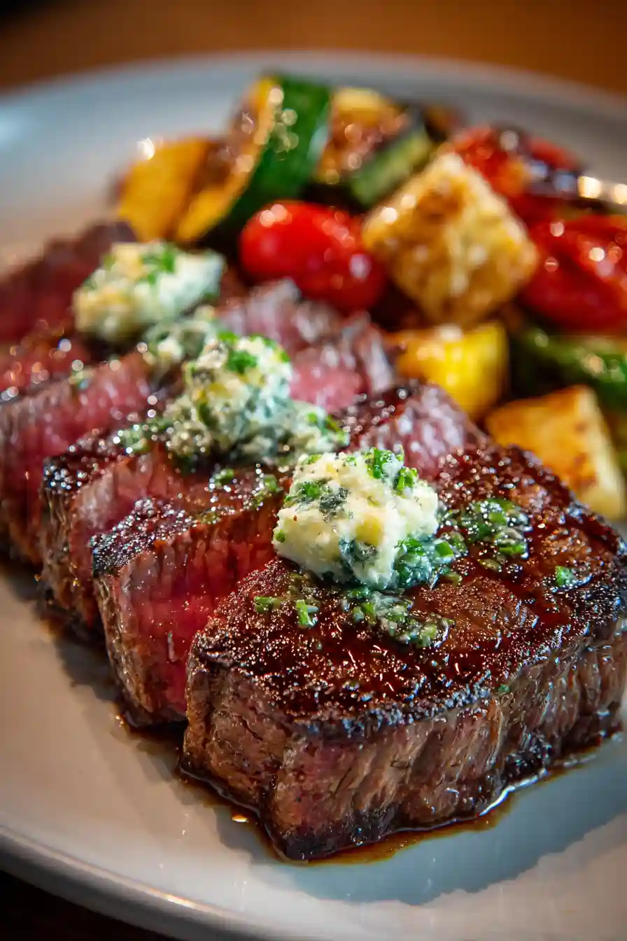 A clean steak dinner aesthetic with pan-seared steak and garlic butter.