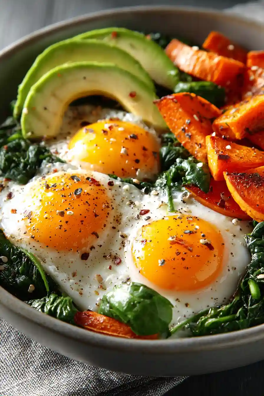 6. Build the Sweet Potato Breakfast Bowl with Eggs by layering potatoes, spinach, eggs, and avocado.