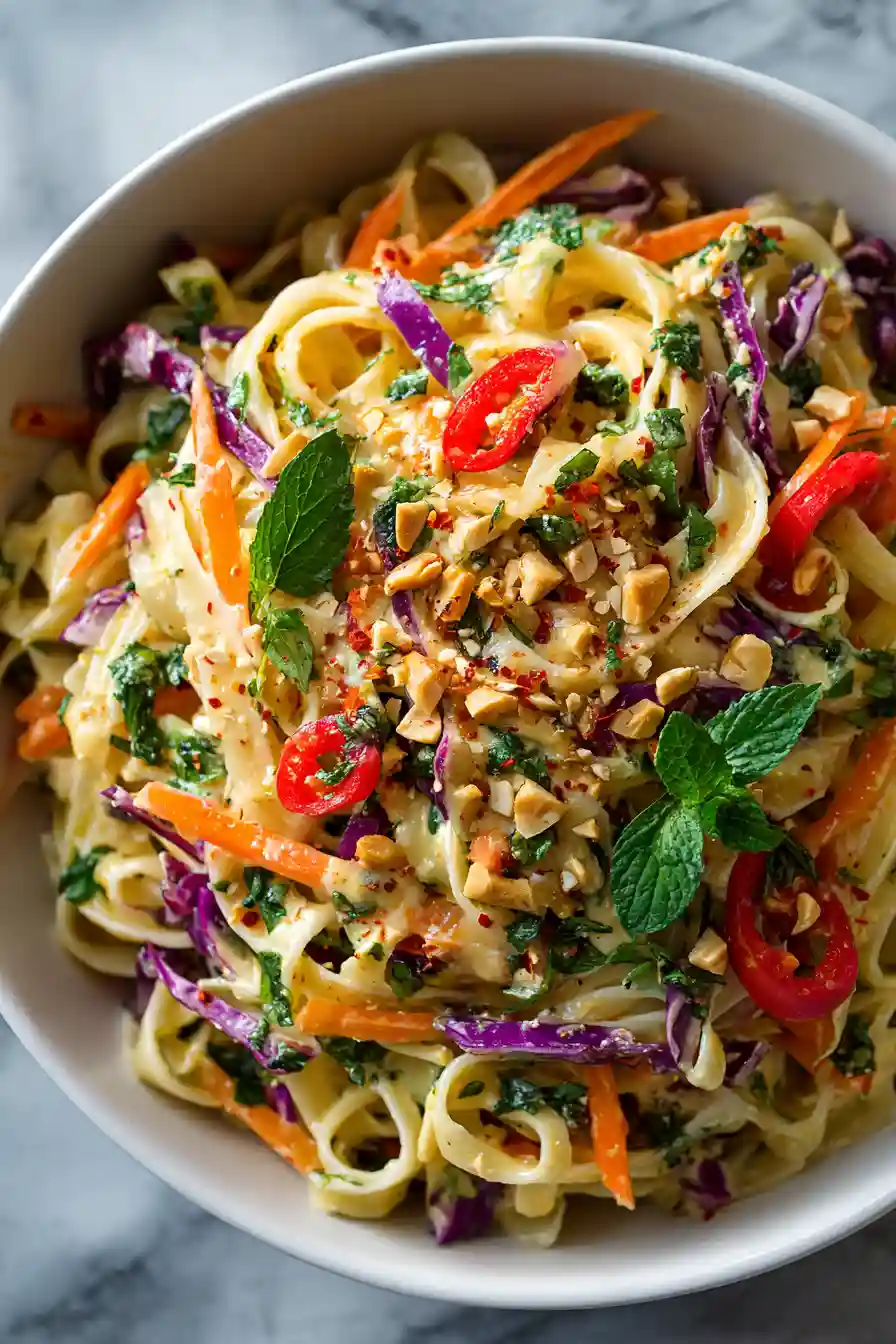 Thai Peanut Noodle Salad with Fresh Herbs delivers bold flavor and refreshing crunch in every bite. Tender noodles blend with crisp vegetables, fragrant cilantro, basil, and mint, all coated in a creamy peanut dressing. This salad tastes savory, slightly sweet, and perfectly balanced.