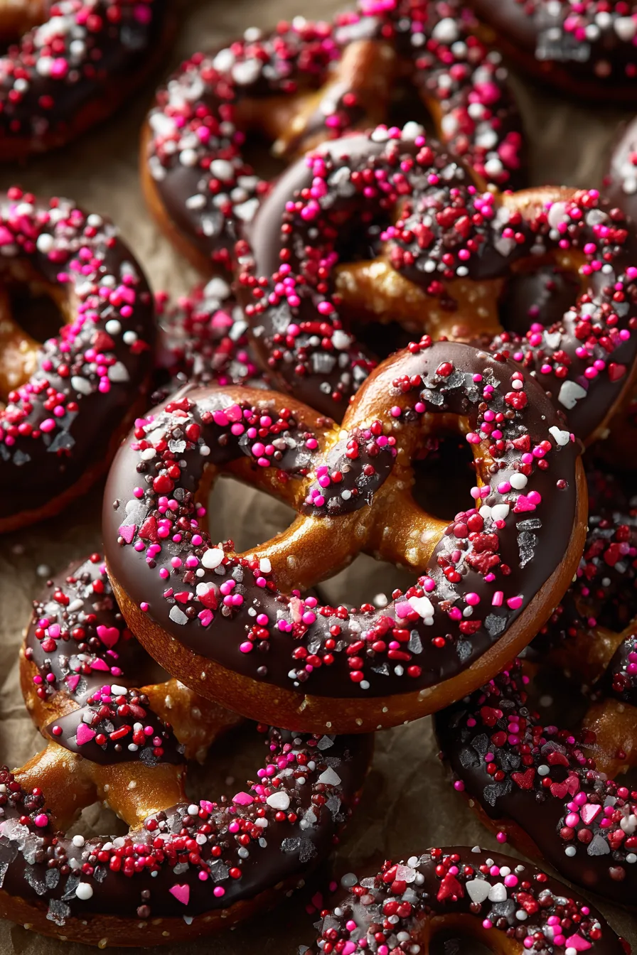Simple chocolate-dipped pretzels made as Valentine treats for coworkers.
